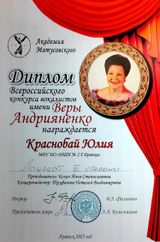 17 мая 2025 года в стенах "Луганской государственной академии культуры и искусств имени Михаила Матусовского" проходил Всероссийский конкурс вокалистов имени Веры Андрияненко. Конкурс собрал более 80 участников из разных населенных пунктов Луганской Народной Республики и других регионов России. Нашу школу достойно представила Краснобай Юлия (класс преподавателя Кохан Инны Станиславовны, концертмейстер - Труфанова Наталья Владимировна). Представив компетентному жюри свою конкурсную программу, Юлия стала лауреатом III степени! Поздравляем!!!Так держать!!!