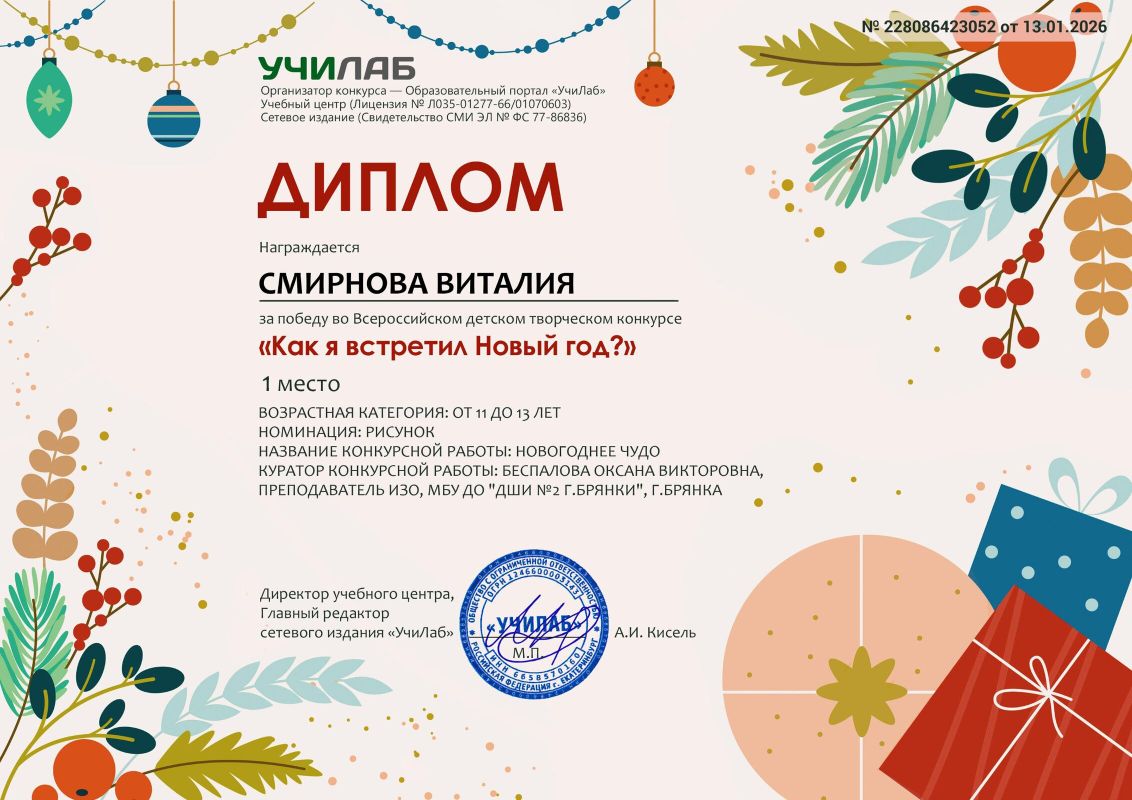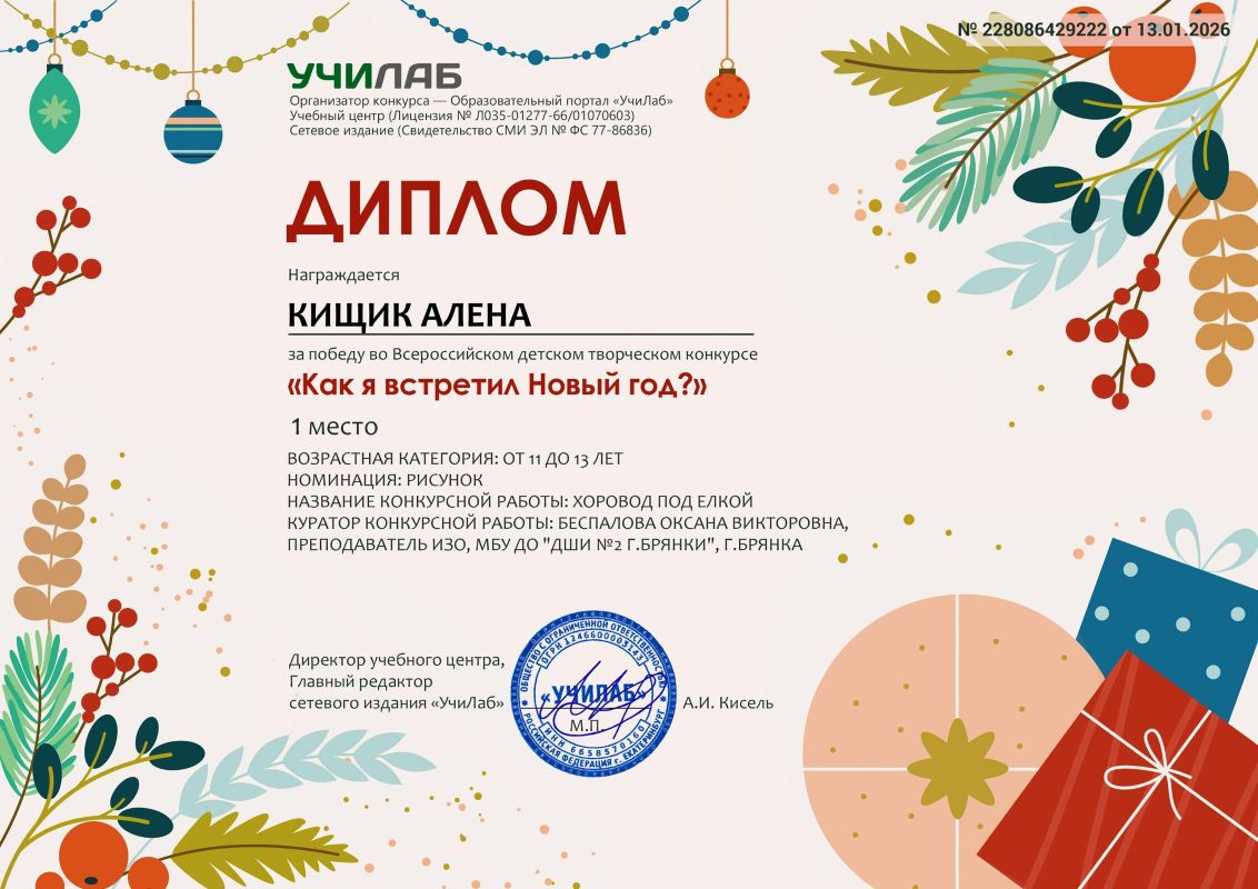 Закончились зимние каникулы, но воспоминания о них еще совсем свежи! Самый веселый и любимый всеми Новый год всегда был и остается маленькой сказкой для детей и даже для взрослых. С этим праздником связаны самые теплые воспоминания — светящаяся ёлка, гирлянды и мишура по дому, хлопушки с сюрпризами, шоколадные конфеты в золотой фольге и волнующее ожидание подарков. Учащиеся художественного отдела МБУ ДО «ДШИ №2 Г.БРЯНКИ» поделились своими самыми яркими впечатлениями с помощью рисунков и приняли участие во Всероссийском детском творческом конкурсе «Как я встретил Новый год?». Поздравляем с занятыми призовыми местами художников класса преподавателя Беспаловой О.В.: Бережанская Анастасия – 1 место, Кищик Алена – 1 место, Милько Анастасия – 1 место, Прядкин Виктор – 1 место, Смирнова Виталия – 1 место.