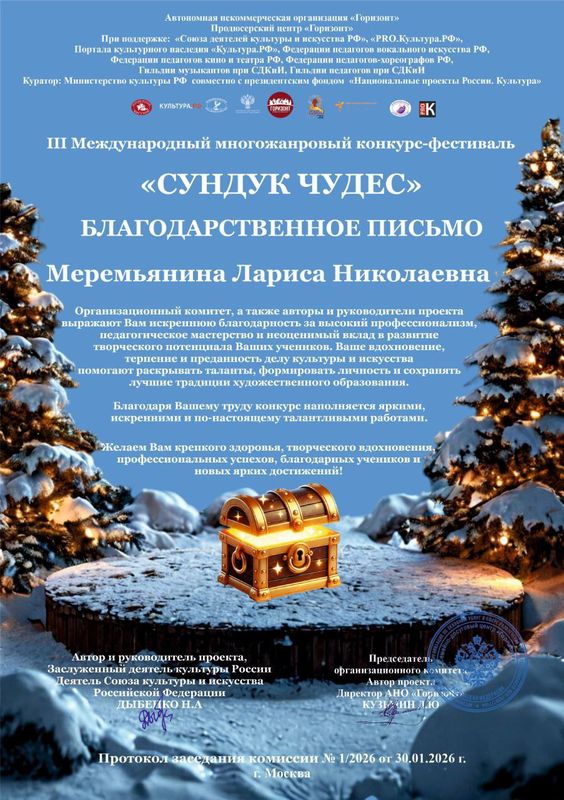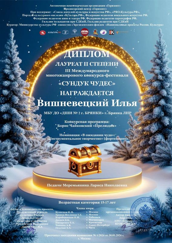 Участие в конкурсах давно стало неотъемлемой частью учебного процесса в детских школах искусств. Вот и сейчас, своё мастерство на III Международном многожанровом конкурсе-фестивале "Сундук чудес" г. Москва, продемонстрировали учащиеся класса фортепиано (преподаватель Меремьянина Л. Н.). Моргунова Варвара и Вишневецкий Илья приготовили к участию яркое исполнение произведений за что и были награждены дипломами Лауреатов II степени!!! Мы гордимся нашими ребятами! Так держать!