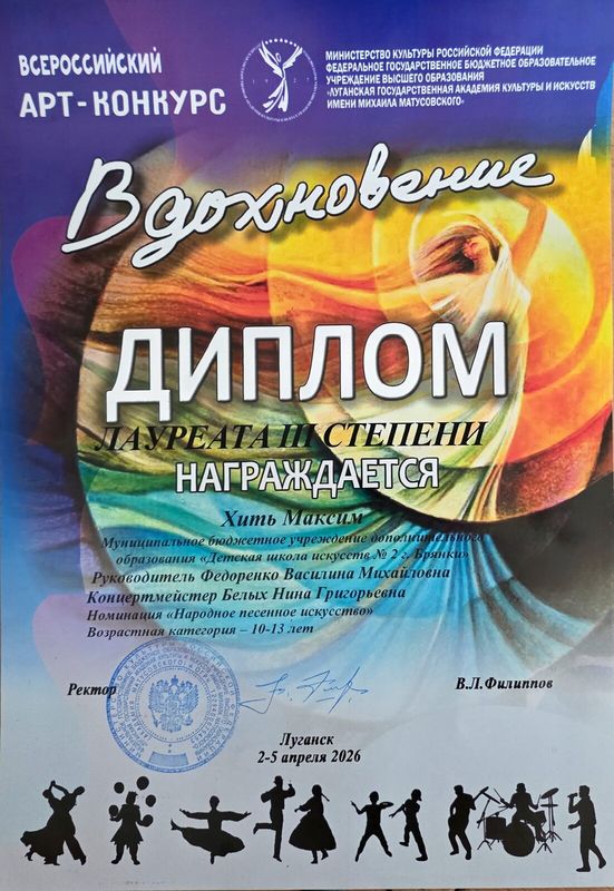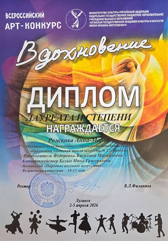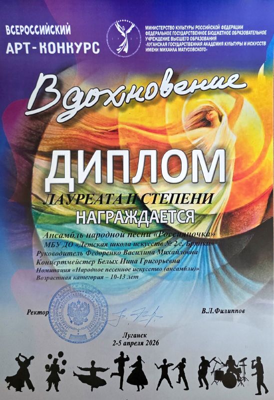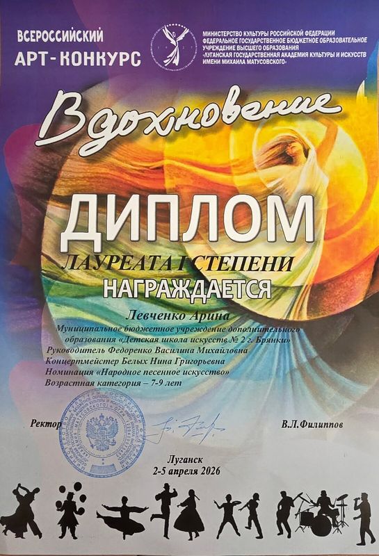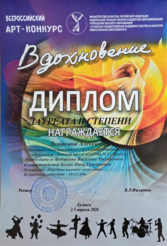 Со 2 по 5 апреля 2026 года в городе Луганск состоялся Всероссийский Арт-конкурс "Вдохновение", собравший множество талантливых юных артистов. Среди ярких участников были учащиеся класса сольного народного пения муниципального бюджетного учреждения дополнительного образования "Детская школа искусств № 2 г. Брянки". Под чутким руководством преподавателя Василины Михайловны Федоренко и в сопровождении талантливого концертмейстера Нины Григорьевны Белых, юные вокалисты достойно представили свою школу.