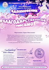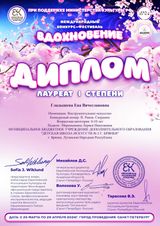 По итогам Международного конкурса-фестиваля "Вдохновение", проводимого в Санкт-Петербурге Европейской Ассоциацией Культуры при поддержке Министерства Культуры РФ, Западного Национального Фонда поддержки культуры и искусства "WNF FRANCE" и Санкт-Петербургской Академии Искусств ЕК, учащаяся нашей школы Гладышева Ева награждена дипломом лауреата I степени, а преподаватель Меремьянина Лариса Николаевна отмечена благодарностью организаторов конкурса!
